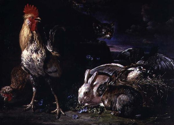 Ad: Order a A Cat Watching Rabbits and Fowl by David de Coninck Reproduction